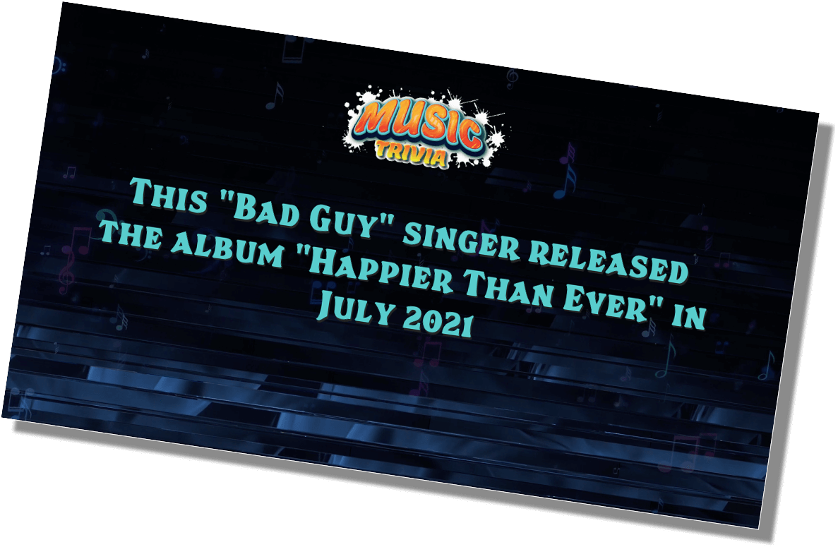Music questions spanning 40 years covering the most popular genres including pop, rock, hip hop, rap, country, indie and more.